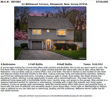 If you’ve been looking for a home that offers both comfort and flexibility, this is one you won’t want to miss. The first level offers a bright living room with a large window that fills the space with natural light, along with two bedrooms—one currently used as a home office—and a full bath. The eat-in kitchen is also located on this level and features sliders that lead directly to the deck, making everyday living and entertaining seamless. Upstairs, you’ll find two additional bedrooms, including a spacious walk-in closet. Even better, the closet already has plumbing in place, offering a great opportunity to easily add a second bathroom. The lower level provides additional living space with a comfortable family room, laundry area, and access to the garage. Step outside to a spacious backyard perfect for relaxing or entertaining, complete with a deck that extends your living space outdoors. A one-car garage adds convenience, while the overall layout offers both charm and practical living. A home with this kind of potential and versatility doesn’t come along often—move right in! Membership to Skyline Lake is optional so you can take part in swimming, boating and the clubhouse. Welcome Home! (seller has NJ real estate license)