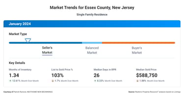As a REALTOR® with NEXTHOME NEW BEGINNINGS, I'm excited to share the latest market trends with you! In January 2024, the median sold price in Essex County is $588,750, with a list to sold price percentage of 103%. Homes are selling quickly, with a median of 26 days on the market. Buyers and sellers, now is the time to make your move! #EssexCountyRealEstate #MarketUpdate