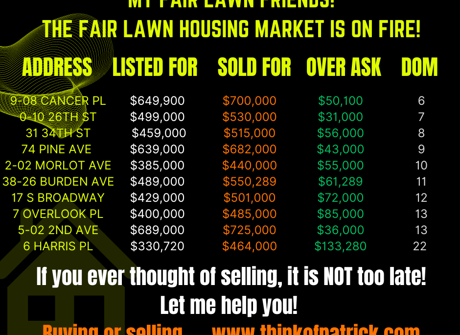 These are actual list and sales prices from a sampling of homes that sold for OVER asking price in Fair Lawn over the past couple months!