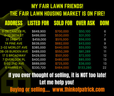 Unfortunately for my buyers, it's still a seller's market in many areas! Fair Lawn is one of them. I check sales records daily, and am consistently seeing home in Fair Lawn selling for over the original list price. This means that there are: